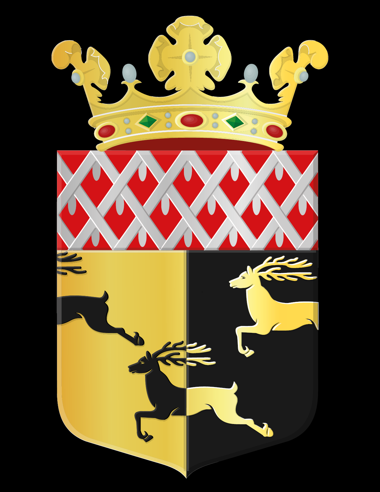 ‘Gedeeld in goud en zwart met drie springende herten, de beide bovenste gaande in en komende uit de schildrand, van het een in het ander; een schildhoofd van keel, getralied met van de kruispunten uitgaande naar beneden gerichte uitgebogen punten, alles in zilver. Het schild gedekt met een gouden kroon van drie bladeren en twee parels.’