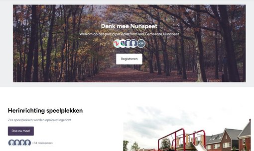 Het platform Denk Mee Nunspeet (denkmee.nunspeet.nl) maakt het gemakkelijker om inwoners te betrekken bij participatieprocessen. En dat is belangrijk want inwoners kunnen waardevolle inzichten leveren die leiden tot goed onderbouwde en effectievere besluiten. Inwoners maken eenmalig een account aan en kunnen aangeven over welke onderwerpen zij graag willen meedenken. Wanneer een bepaald participatieproject start, ontvangen inwoners automatisch een bericht en kunnen zij hun input delen.