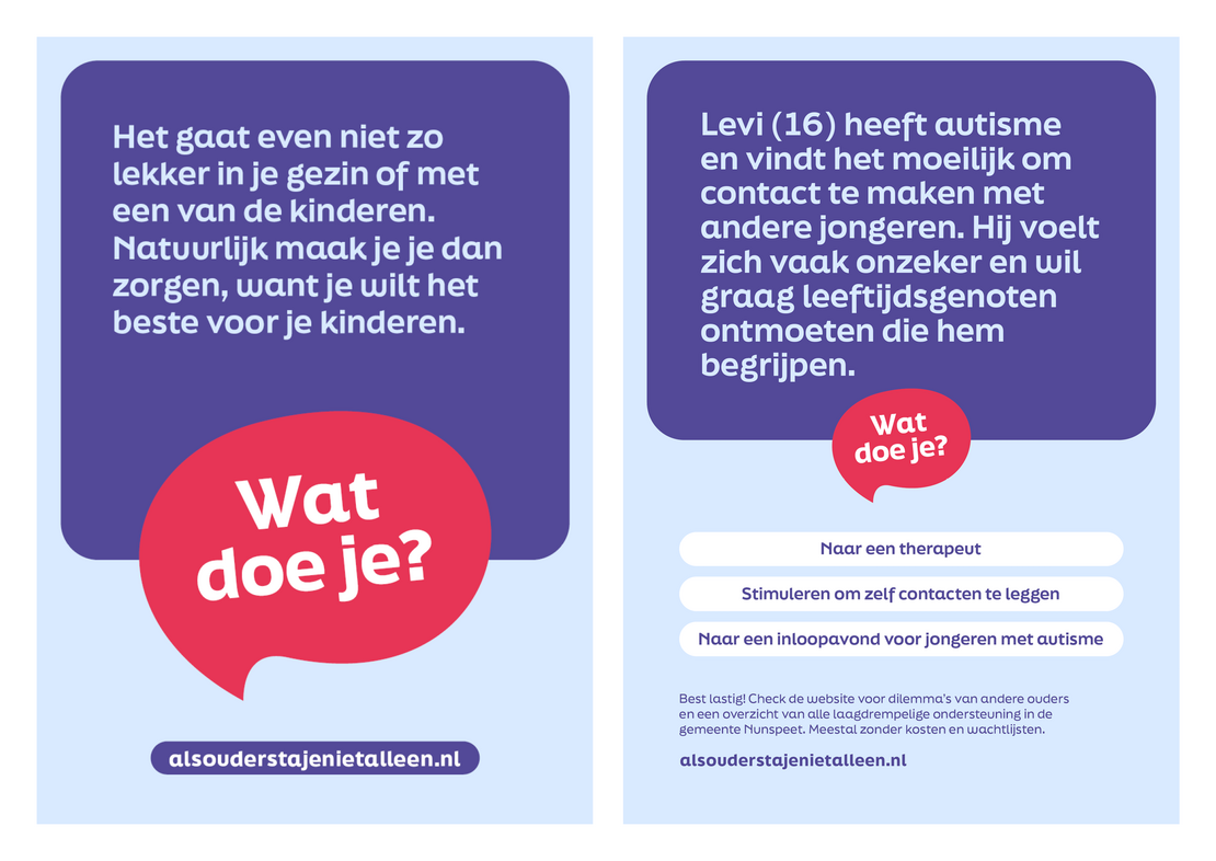Ouders die op zoek zijn naar informatie of ondersteuning kunnen terecht op de website alsouderstajenietalleen.nl voor een overzicht van het lokale aanbod van o.a. Stimenz, Centrum voor Jeugd & Gezin, GGD, Straathoekwerk, Het Venster, Oranjehof, Stichting Welzijn Nunspeet en kerken. De campagne wordt breed uitgerold via diverse communicatiemiddelen van de genoemde partijen, gemeente, onderwijs en huisartsen.